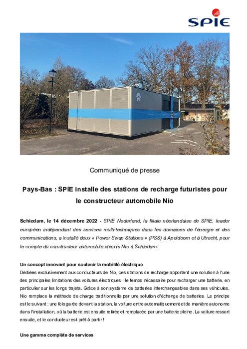 SPIE Nederland, la filiale néerlandaise de SPIE, leader européen indépendant des services multi-techniques dans les domaines de l'énergie et des communications, a installé deux « Power Swap Stations » (PSS) à Apeldoorn et à Utrecht, pour le compte du constructeur automobile chinois Nio à Schiedam.