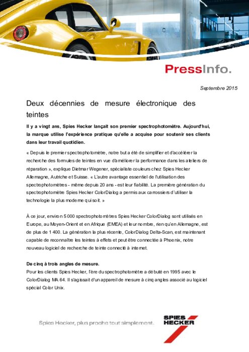 Equipementiers 23 septembre 2015 - 12:13 Il y a vingt ans, Spies Hecker lançait son premier spectrophotomètre. Aujourd'hui, la marque utilise l’expérience pratique qu’elle a acquise pour soutenir ses clients dans leur travail quotidien. PDF (116 Ko) Télécharger