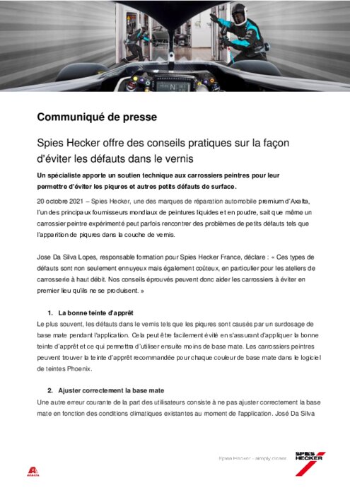 Spies Hecker, une des marques de réparation automobile premium d’Axalta, l’un des principaux fournisseurs mondiaux de peintures liquides et en poudre, sait que même un carrossier peintre expérimenté peut parfois rencontrer des problèmes de petits défauts tels que l’apparition de piqures dans la couche de vernis.