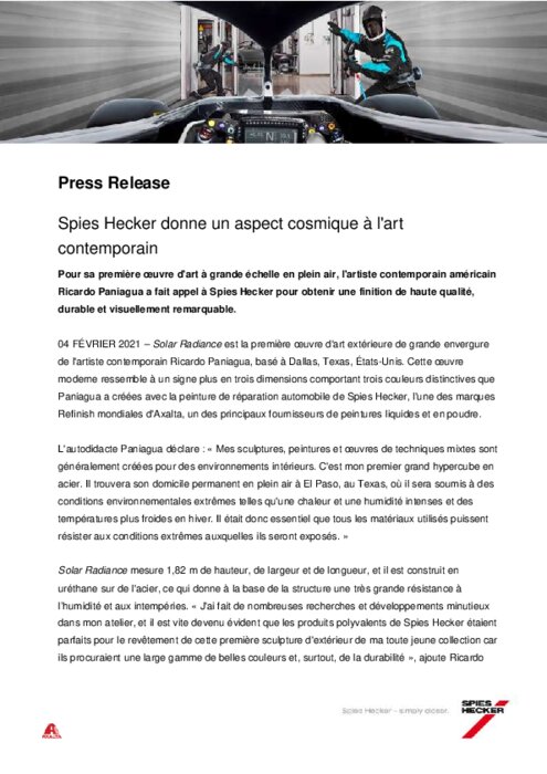 Pour sa première œuvre d'art à grande échelle en plein air, l'artiste contemporain américain Ricardo Paniagua a fait appel à Spies Hecker pour obtenir une finition de haute qualité, durable et visuellement remarquable. Solar Radiance est la première œuvre d'art extérieure de grande envergure de l'artiste contemporain Ricardo Paniagua, basé à Dallas, Texas, États-Unis...