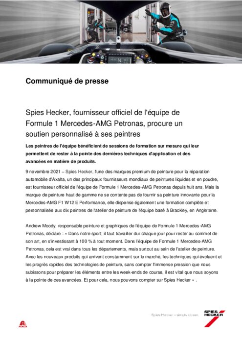 Spies Hecker, l'une des marques premium de peinture pour la réparation automobile d'Axalta, est fournisseur officiel de l'équipe de Formule 1 Mercedes-AMG Petronas depuis huit ans. Mais la marque de peinture haut de gamme ne se contente pas de fournir sa peinture innovante pour la Mercedes-AMG F1 W12 E Performance, elle dispense également une formation complète et personnalisée aux dix peintres de l'atelier de peinture de l'équipe basé à Brackley, en Angleterre...