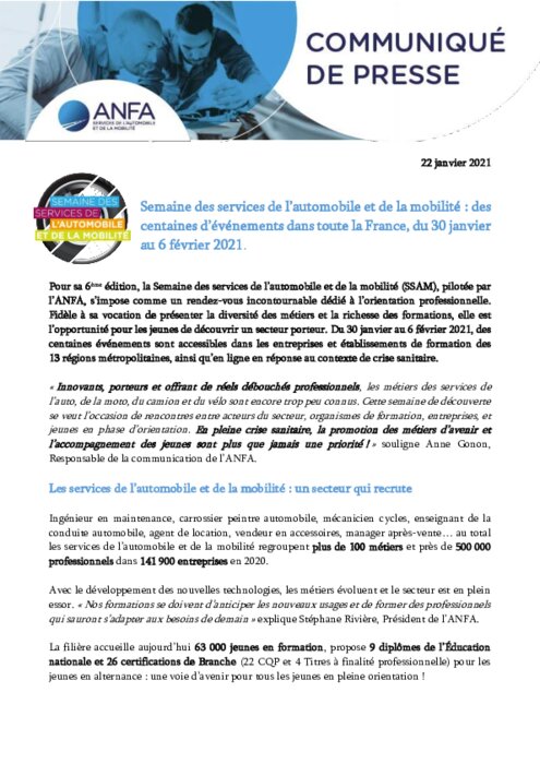 Pour sa 6ème édition, la Semaine des services de l’automobile et de la mobilité (SSAM), pilotée par l’ANFA, s’impose comme un rendez-vous incontournable dédié à l’orientation professionnelle. Du 30 janvier au 6 février 2021, des centaines événements sont accessibles dans les entreprises et établissements de formation des 13 régions métropolitaines, ainsi qu’en ligne en réponse au contexte de crise sanitaire.