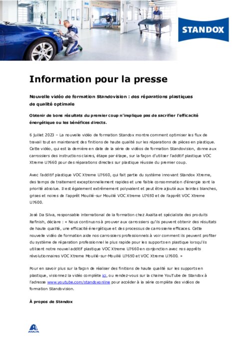Cette vidéo, qui est la dernière en date de la série de vidéos de formation Standovision, donne aux carrossiers des instructions claires, étape par étape, sur la façon d'utiliser l'additif plastique VOC Xtreme U7660 pour des réparations directes sur plastique réussie du premier coup.