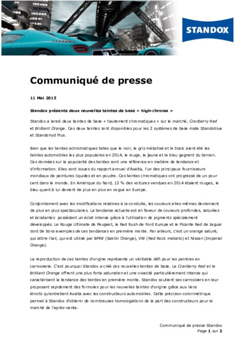 Standox a lancé deux teintes de base « hautement chromatiques » sur le marché, Cranberry Red et Brilliant Orange. Ces deux teintes sont disponibles pour les 2 systèmes de base mate Standoblue et Standohyd Plus. Bien que les teintes achromatiques telles que le noir, le gris métallisé et le blanc aient été les teintes automobiles les plus populaires en 2014, le rouge, le jaune et le bleu gagnent du terrain. Ces données sur la popularité des teintes sont une référence en matière de tendance...