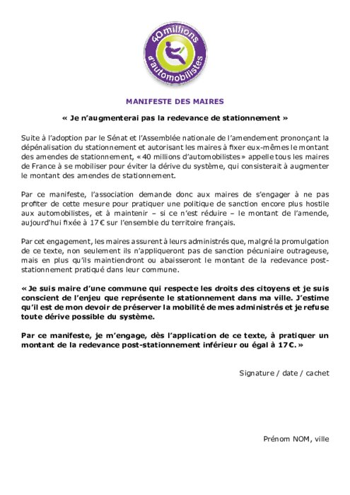 Suite à l'adoption par le Sénat et l'Assemblée nationale de l'amendement prononçant la dépénalisation du stationnement et autorisant les maires à fixer eux-mêmes le montant des amendes de stationnement, " 40 millions d'automobilistes " appelle tous les maires de France à se mobiliser pour éviter la dérive du système, qui consisterait à augmenter le montant des amendes de stationnement.