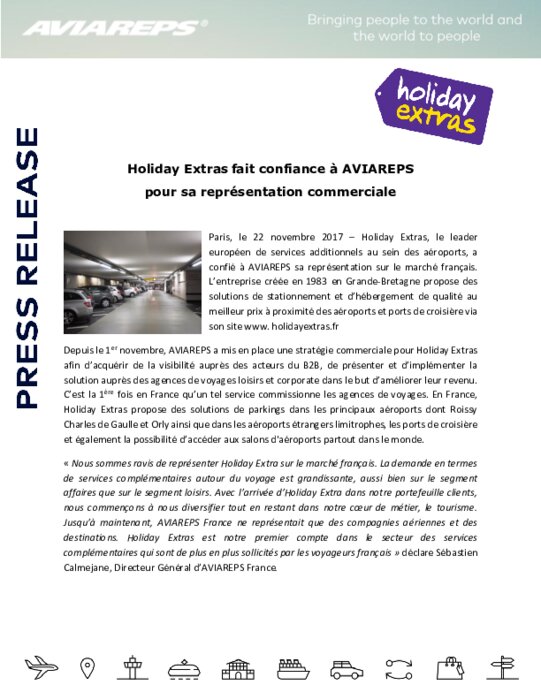Paris, le 22 novembre 2017 - Holiday Extras, le leader européen de services additionnels au sein des aéroports, a confié à AVIAREPS sa représentation sur le marché français. L'entreprise créée en 1983 en Grande-Bretagne propose des solutions de stationnement et d'hébergement de qualité au meilleur prix à proximité des aéroports et ports de croisière via son site www.holidayextras.fr