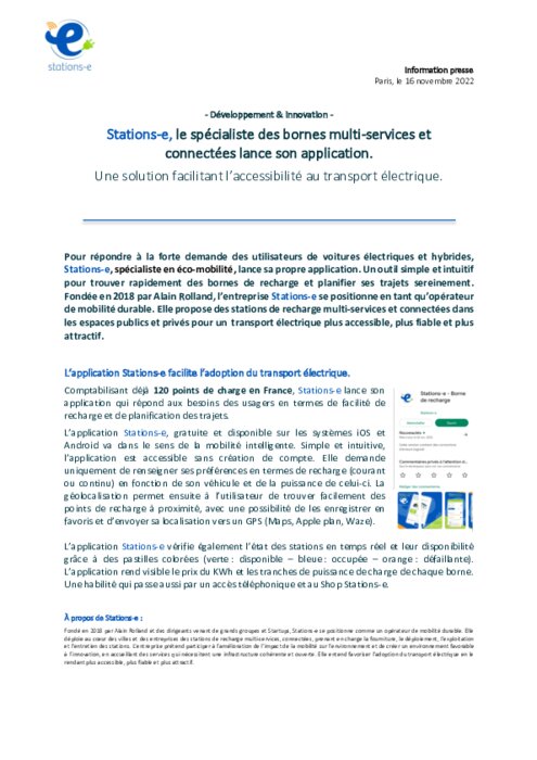 Fondée en 2018 par Alain Rolland et après avoir réalisé une levée de fonds de 30 millions d'euros, l’entreprise Stations-e se positionne en tant qu’opérateur de mobilité durable. Elle propose des stations de recharge multi-services et connectées dans les espaces publics et privés pour un transport électrique plus accessible, plus fiable et plus attractif. STATIONS-e sera présent au salon des Maires et des collectivités du 22 au 24 novembre ! - Porte de Versailles - à Paris.