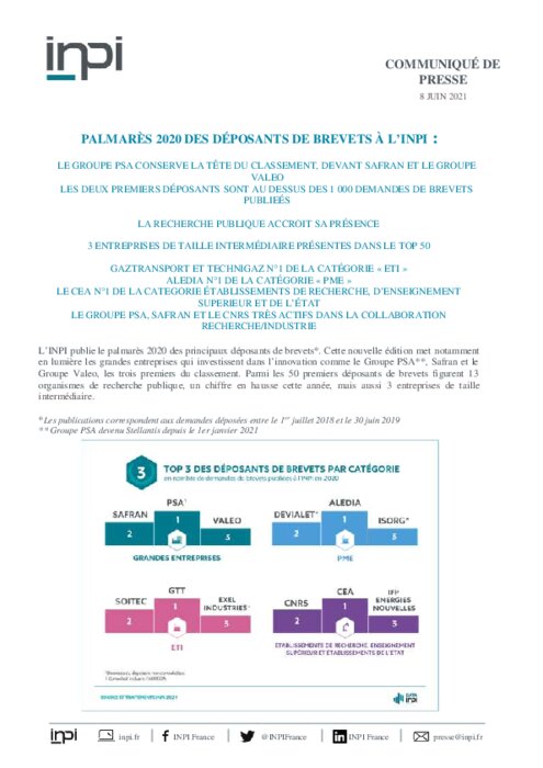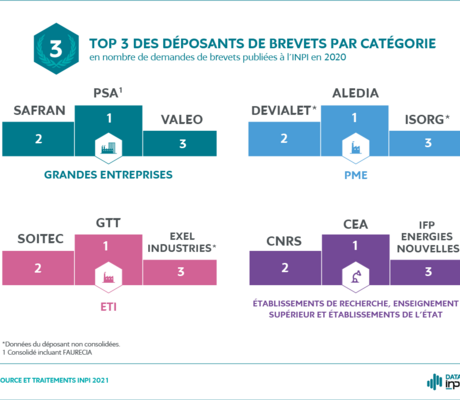 Le Commissariat à l'Energie atomique et aux énergies alternatives (CEA) conserve la quatrième place avec 646 demandes publiées en 2020. Le groupe Renault arrive en 5e place avec 483 demandes de brevets publiées.