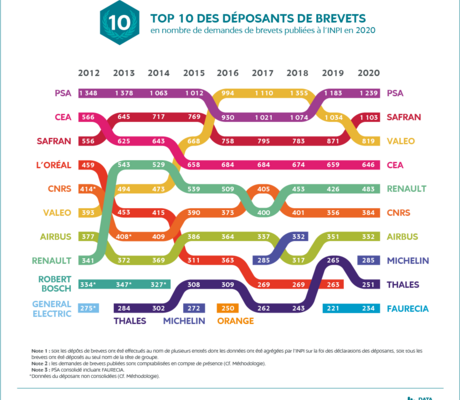 Sur les dix premiers groupes du palmarès, sept opèrent dans le secteur des transports (PSA, Safran, Valeo, Renault, Airbus, Michelin, Faurecia).