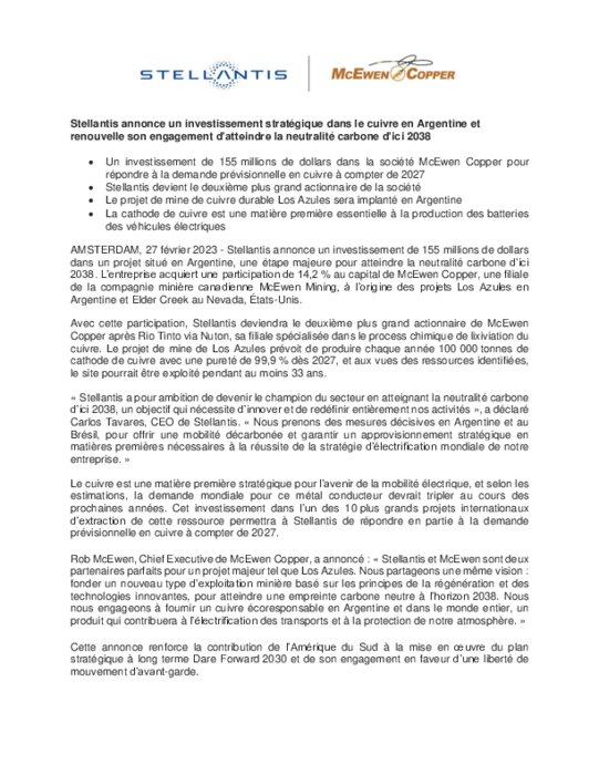 Stellantis annonce un investissement de 155 millions de dollars dans un projet situé en Argentine, une étape majeure pour atteindre la neutralité carbone d’ici 2038. L’entreprise acquiert une participation de 14,2 % au capital de McEwen Copper, une filiale de la compagnie minière canadienne McEwen Mining, à l’origine des projets Los Azules en Argentine et Elder Creek au Nevada, États-Unis.