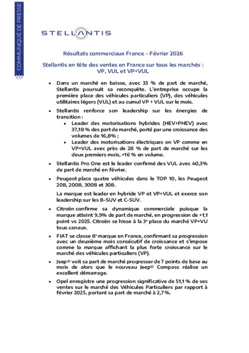 Constructeurs 02 mars 2026 - 14:39 Dans un marché en baisse, avec 33 % de part de marché, Stellantis poursuit sa reconquête. L’entreprise occupe la première place des véhicules particuliers (VP), des véhicules utilitaires légers (VUL) et au cumul VP + VUL sur le mois. PDF (110 Ko) Télécharger