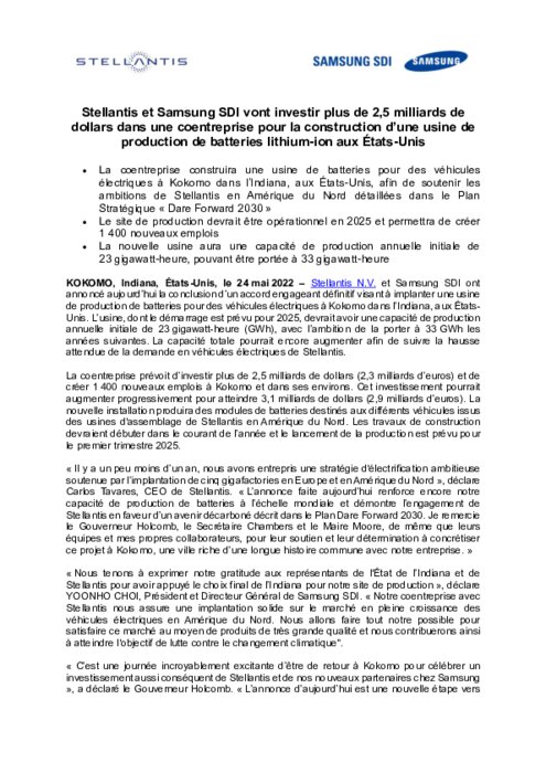 Stellantis N.V. et Samsung SDI ont annoncé aujourd’hui la conclusion d’un accord engageant définitif visant à implanter une usine de production de batteries pour des véhicules électriques à Kokomo dans l’Indiana, aux ÉtatsUnis. L’usine, dont le démarrage est prévu pour 2025, devrait avoir une capacité de production annuelle initiale de 23 gigawatt-heure (GWh), avec l’ambition de la porter à 33 GWh les