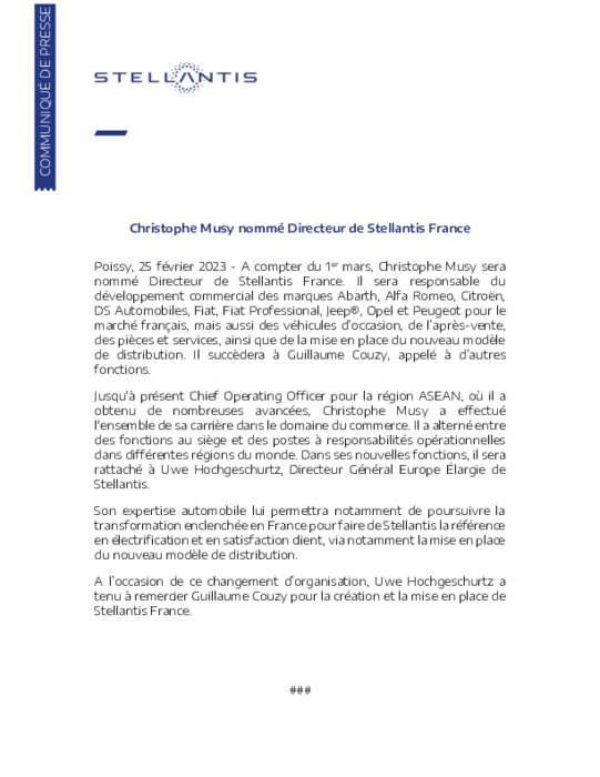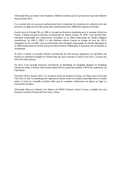 A compter du 1er mars, M. Musy sera responsable du développement commercial des principales marques de Stellantis (Peugeot, Citroën, Opel, Fiat, Jeep, DS, Alfa Romeo) pour le marché français, mais aussi des véhicules d'occasion, de l'après-vente, des pièces et services, ainsi que de la mise en place du nouveau modèle de distribution, selon Stellantis.