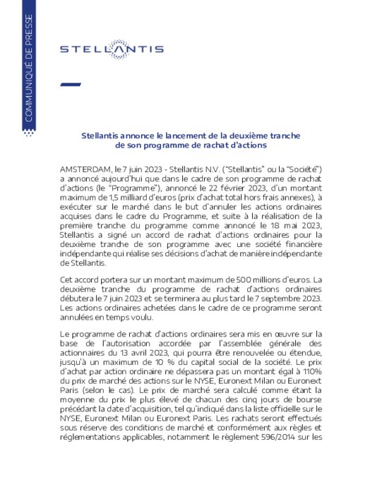 AMSTERDAM, le 7 juin 2023 - Stellantis N.V. (“Stellantis” ou la “Société”) a annoncé aujourd’hui que dans le cadre de son programme de rachat d’actions (le “Programme”), annoncé le 22 février 2023, d’un montant maximum de 1,5 milliard d’euros (prix d’achat total hors frais annexes), à exécuter sur le marché dans le but d’annuler les actions ordinaires acquises dans le cadre du Programme, et suite à la réalisation de la première tranche du programme comme annoncé le 18 mai 2023.