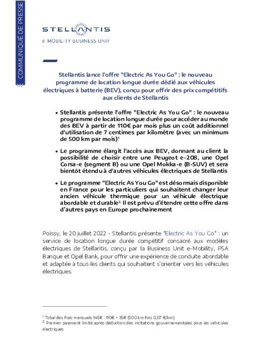 Stellantis présente l'offre "Electric As You Go" : le nouveau programme de location longue durée pour accéder au monde des BEV à partir de 110€ par mois plus un coût additionnel d'utilisation de 7 centimes par kilomètre (avec un minimum de 500 km par mois). Le programme élargit l'accès aux BEV, donnant au client la possibilité de choisir entre une Peugeot e-208, une Opel Corsa-e (segment B) ou une Opel Mokka-e (B-SUV) et sera bientôt étendu à d'autres véhicules électriques de Stellantis.