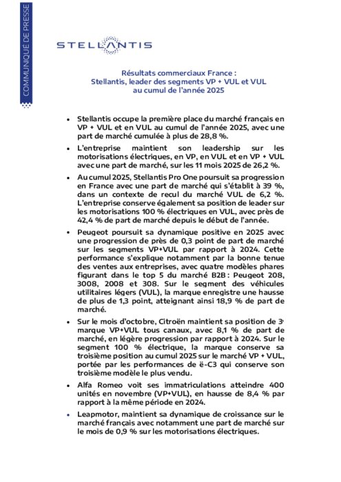 Au cumul 2025, Stellantis France confirme sa position de leader sur les segments VP +VUL et VUL avec une part de marché de plus de 28,8 %. Quatre modèles Peugeot et Citroën se positionnent dans le top 10 des véhicules du marché VP depuis le début de l’année : Peugeot 208, Citroën C3, Peugeot 2008 et Peugeot 3008.