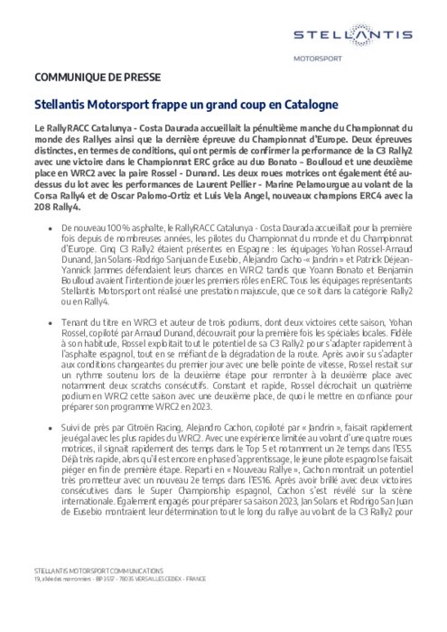 Lors de la pénultième manche du Championnat du monde des Rallyes ainsi que la dernière épreuve du Championnat d’Europe. Deux épreuves distinctes qui ont confirmé la performance de la C3 Rally2 avec une victoire dans le Championnat ERC grâce au duo Bonato – Boulloud et une deuxième place en WRC2 avec la paire Rossel - Dunand.