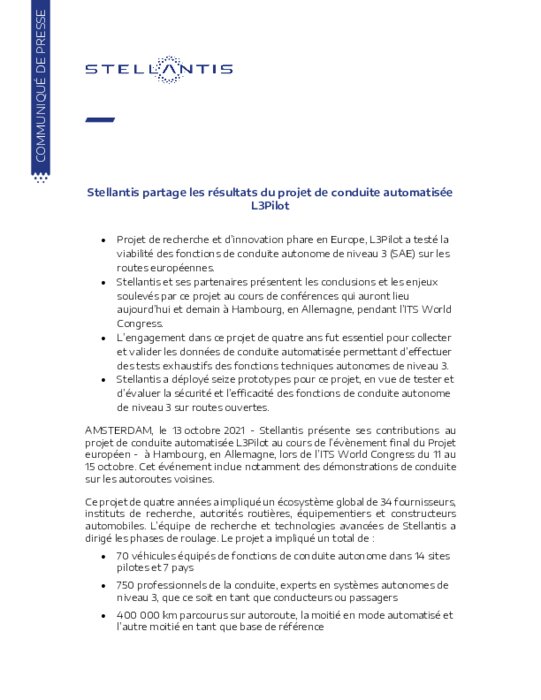 Stellantis présente ses contributions au projet de conduite automatisée L3Pilot au cours de l’évènement final du Projet européen - à Hambourg, en Allemagne, lors de l’ITS World Congress du 11 au 15 octobre. Cet événement inclue notamment des démonstrations de conduite sur les autoroutes voisines.