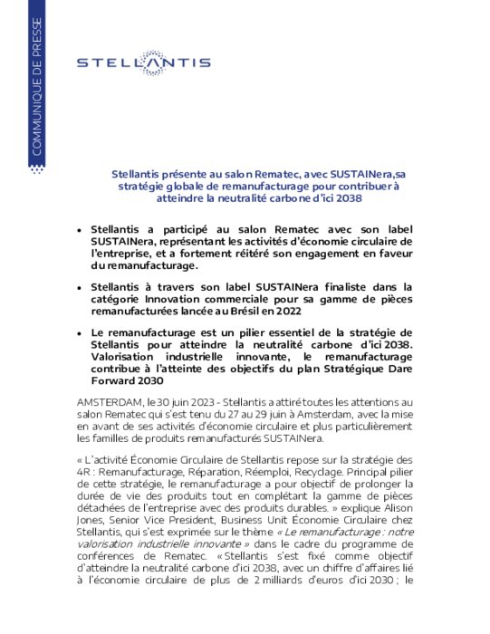 Stellantis a attiré toutes les attentions au salon Rematec qui s’est tenu du 27 au 29 juin à Amsterdam, avec la mise en avant de ses activités d’économie circulaire et plus particulièrement les familles de produits remanufacturés SUSTAINera. « L’activité Économie Circulaire de Stellantis repose sur la stratégie des 4R : Remanufacturage, Réparation, Réemploi, Recyclage. Principal pilier de cette stratégie, le remanufacturage a pour objectif de prolonger la durée de vie des produits.