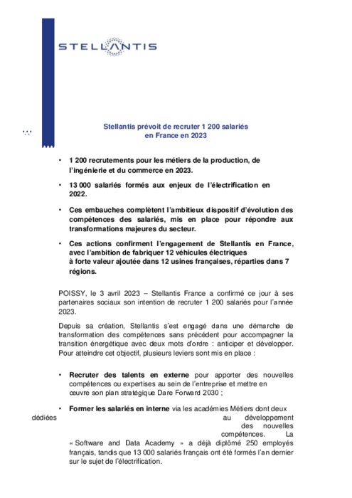 Stellantis, né de la fusion de PSA (Peugeot, Citroën, Opel) avec FCA (Fiat, Chrysler), a précisé aux syndicats son intention de recruter 1.200 salariés en France cette année "pour les métiers de la production, de l'ingénierie et du commerce".