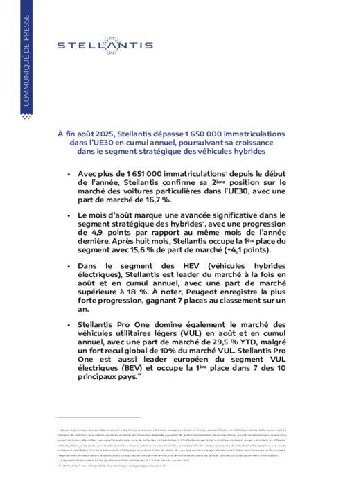 Stellantis réaffirme sa solide position sur le marché automobile européen, clôturant les huit premiers mois de l’année avec plus de 1 650 000 immatriculations. L’entreprise consolide son leadership sur des marchés clés tels que la France et l’Italie, et continue de dominer à la fois le segment stratégique des véhicules hybrides et celui des véhicules utilitaires légers.