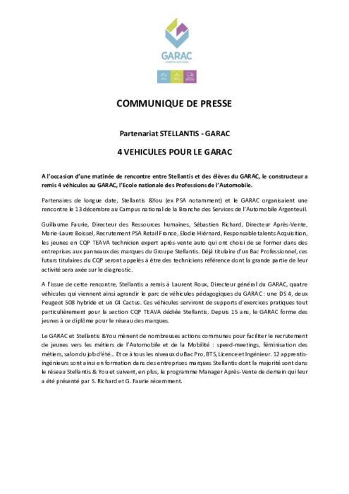 A l’occasion d’une matinée de rencontre entre Stellantis et des élèves du GARAC, le constructeur a remis 4 véhicules au GARAC, l’Ecole nationale des Professions de l’Automobile. Partenaires de longue date, Stellantis &You (ex PSA notamment) et le GARAC organisaient une rencontre le 13 décembre au Campus national de la Branche des Services de l’Automobile Argenteuil.