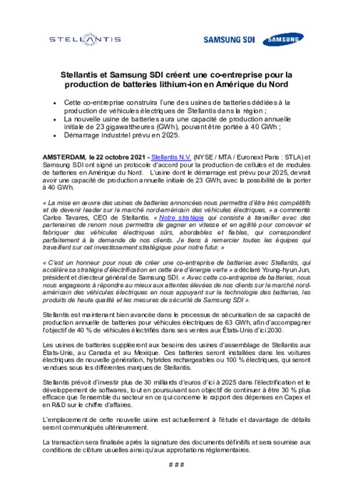 Stellantis et Samsung SDI ont signé un protocole d’accord pour la production de cellules et de modules de batteries en Amérique du Nord. L’usine dont le démarrage est prévu pour 2025, devrait avoir une capacité de production annuelle initiale de 23 GWh, avec la possibilité de la porter à 40 GWh...