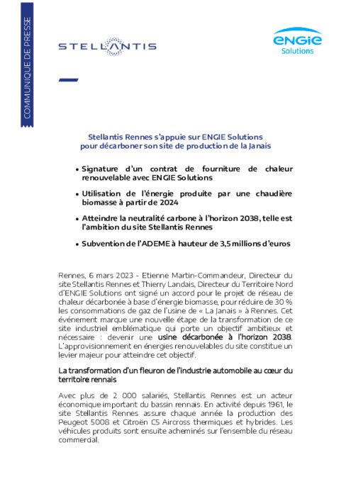 Etienne Martin Commandeur, Directeur du site Stellantis Rennes et Thierry Landais, Directeur du Territoire Nord d’ENGIE Solutions ont signé un accord pour le projet de réseau de chaleur décarbonée à base d’énergie biomasse, pour réduire de 30 % les consommations de gaz de l’usine de « La Janais » à Rennes. Cet événement marque une nouvelle étape de la transformation de ce site industriel emblématique qui porte un objectif ambitieux et nécessaire : devenir une usine décarbonée à l’horizon 2038 .
