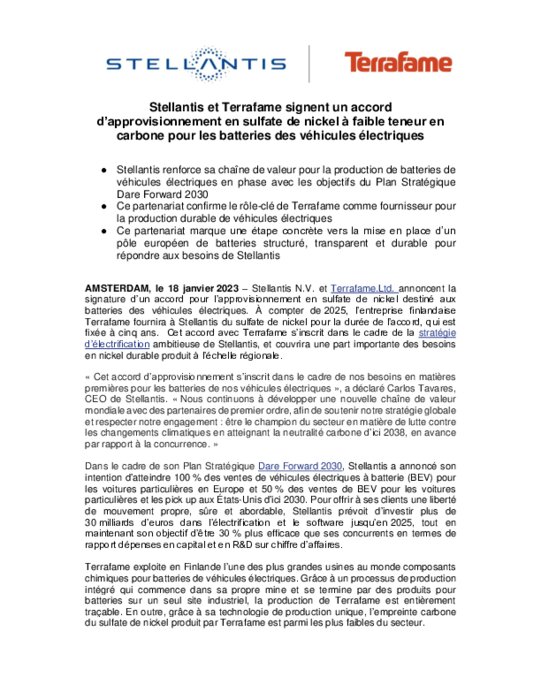 A partir de 2025, Terrafame fournira ainsi à Stellantis du sulfate de nickel pour cinq ans, la durée de l'accord, "dans le cadre de la stratégie d'électrification" de Stellantis.