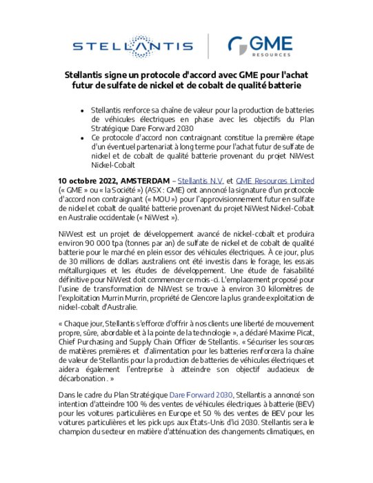 Stellantis N.V. et GME Resources Limited ont annoncé la signature d'un protocole d'accord non contraignant (« MOU ») pour l’approvisionnement futur en sulfate de nickel et cobalt de qualité batterie provenant du projet NiWest Nickel-Cobalt en Australie occidentale (« NiWest »).