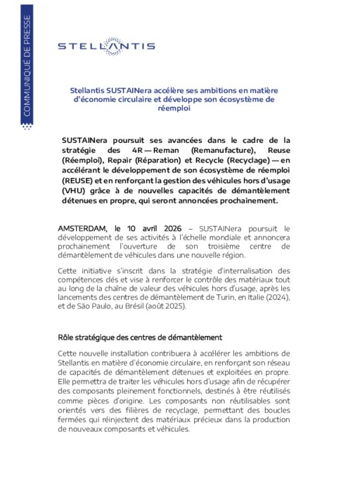 SUSTAINera poursuit ses avancées dans le cadre de la stratégie des 4R — Reman (Remanufacture), Reuse (Réemploi), Repair (Réparation) et Recycle (Recyclage) — en accélérant le développement de son écosystème de réemploi (REUSE) et en renforçant la gestion des véhicules hors d’usage (VHU) grâce à de nouvelles capacités de démantèlement détenues en propre, qui seront annoncées prochainement.