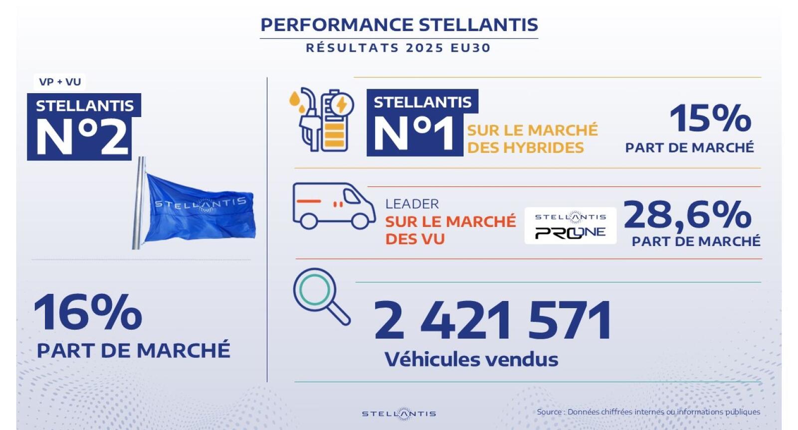 Avec 2 421 571 immatriculations (VP+VUL) et une part de marché de 16 %, Stellantis termine l’année 2025 en tant que 2e plus grand constructeur automobile dans l’EU30. Le constructeur conserve la première place dans le segment stratégique des véhicules hybrides avec une part de marché de 15 %. Il a par ailleurs confirmé son leadership traditionnel sur le segment des véhicules utilitaires, avec une part de marché de 28,6 %.