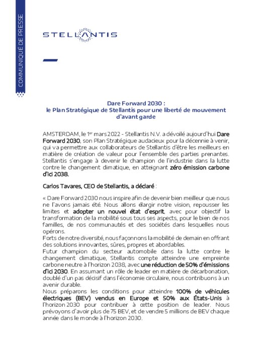 Le groupe issu de la fusion de Peugeot-Citroën et Fiat-Chrysler veut diviser ses émissions de carbone par deux d'ici à 2030 par rapport à celles de 2021, et les abaisser de 90% d'ici à 2038. Le groupe évoque un bilan "zéro émission carbone" avec 10% de compensation maximum.