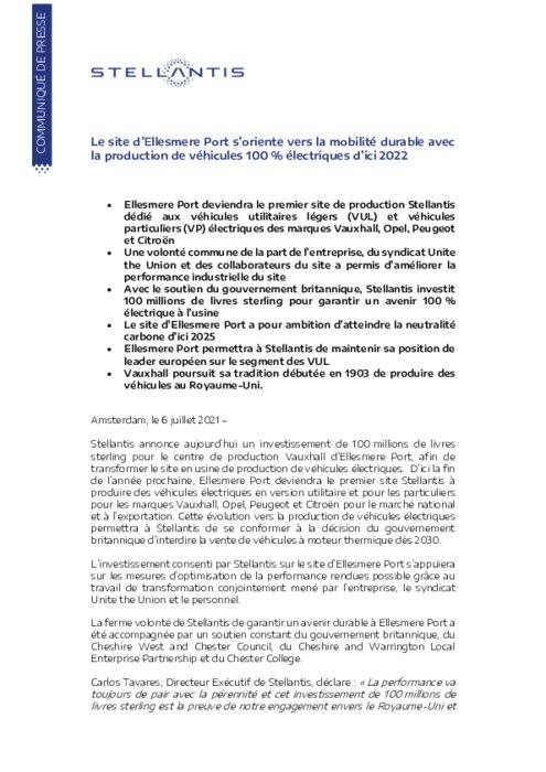 Stellantis avait fait savoir depuis des mois que l'avenir d'Ellesmere Port était en jeu et que l'une des options serait d'y fabriquer un véhicule électrique, à condition de bénéficier d'un soutien substantiel du gouvernement britannique, qui veut bannir la vente de véhicules à essence au Royaume-Uni à partir de 2030.