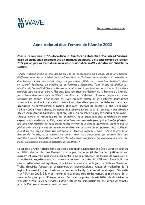 Constructeurs 14 novembre 2022 - 13:56 Anne Abboud, Directrice de Stellantis & You, Sales & Services, filiale de distribution en propre des dix marques du groupe, a été élue Femme de l’année 2022 par un jury de journalistes réunis par l’association WAVE - WoMen and Vehicles in Europe. PDF (200 Ko) Télécharger