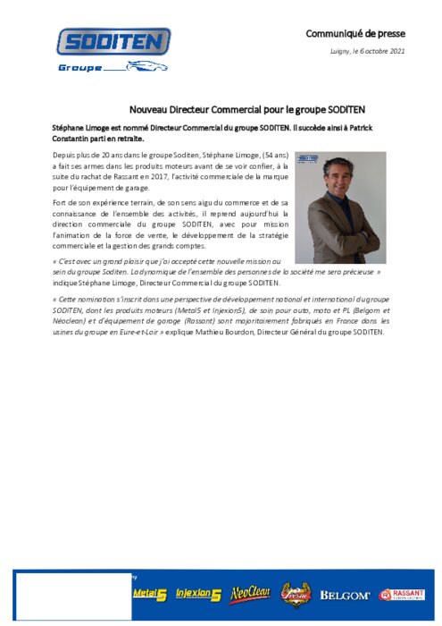 Stéphane Limoge est nommé Directeur Commercial du groupe SODITEN. Il succède ainsi à Patrick Constantin parti en retraite. Depuis plus de 20 ans dans le groupe Soditen, Stéphane Limoge, (54 ans) a fait ses armes dans les produits moteurs avant de se voir confier, à la suite du rachat de Rassant en 2017, l’activité commerciale de la marque pour l’équipement de garage.