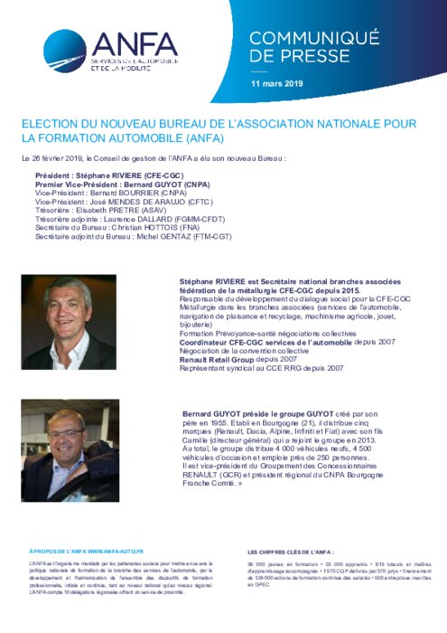 Services 11 mars 2019 - 10:39 Le 26 février 2019, le Conseil de gestion de l’ANFA a élu son nouveau bureau. Le Président élu est Stéphane RIVIERE (CFE-CGC). PDF (442 Ko) Télécharger