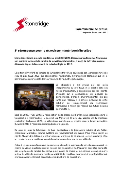 Equipementiers 01 mars 2021 - 15:56 Stoneridge-Orlaco a reçu le prestigieux prix PACE 2020 décerné par Automotive News pour son système innovant de caméra de surveillance MirrorEye. Il s’agit de la 3e récompense décernée depuis le lancement de la technologie en 2017. PDF (184 Ko) Télécharger
