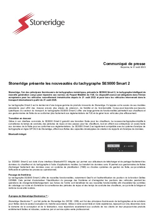 Stoneridge, l'un des principaux fournisseurs de tachygraphes numériques, présente le SE5000 Smart 2, le tachygraphe intelligent de nouvelle génération conçu pour répondre aux normes du Paquet Mobilité de l'UE. Ce dispositif avancé est obligatoire dans l'Union européenne pour les véhicules nouvellement immatriculés depuis le 21 août 2023 et pour tous les véhicules intervenant dans le transport international à partir du 21 août 2025.