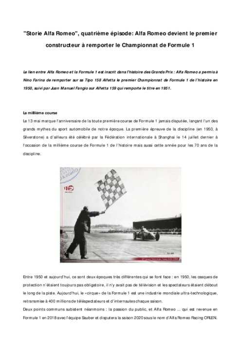 Le lien entre Alfa Romeo et la Formule 1 est inscrit dans l'histoire des Grands Prix : Alfa Romeo a permis à Nino Farina de remporter sur sa Tipo 158 Alfetta le premier Championnat de Formule 1 de l’histoire en 1950, suivi par Juan Manuel Fangio sur Alfetta 159 qui remporte le titre en 1951.