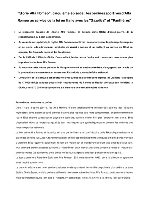 Le cinquième épisode de " Storie Alfa Romeo " se déroule dans l'Italie d'après-guerre, de la reconstruction au boom économique. Au cours de cette période, le mythe Alfa Romeo se confirme : ses voitures sont les plus rapides en piste et sur route, elles deviennent symboles de réussite sociale et se mettent au service de l'Etat en équipant les forces de police et les Carabinieri...