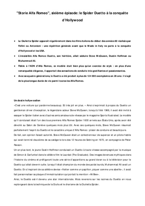 " C'est une voiture qui pardonne beaucoup. Et très joli en plus. " Ainsi s’exprimait à propos du Duetto un gentleman driver d’exception, le légendaire acteur Steve McQueen, lorsqu’à l’été 1966, il avait été invité à essayer le Spider italien avec d’autres amis amateurs de vitesse par le magazine Sports Illustrated. Le modèle qu'il conduisait était l'un des tous premiers Alfa Romeo Spider 1600 arrivés aux États-Unis, après avoir été dévoilé au Salon de Genève quelques mois plus tôt.