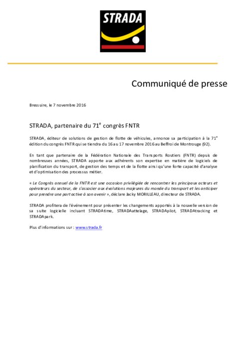 Services 07 novembre 2016 - 11:36 STRADA, éditeur de solutions de gestion de flottes de véhicules, annonce sa participation à la 71ème édition du congrès FNTR qui se tiendra du 16 au 17 novembre. PDF (108 Ko) Télécharger