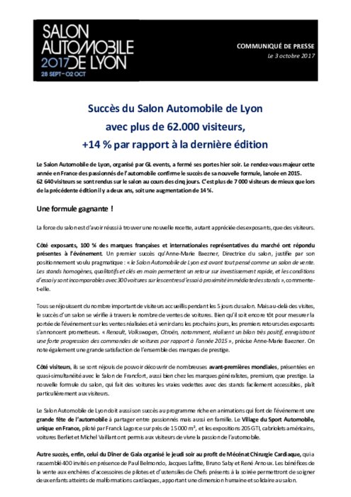 Le Salon Automobile de Lyon, organisé par GL events, a fermé ses portes lundi 2 octobre. Le rendez-vous majeur cette année en France des passionnés de l'automobile confirme le succès de sa nouvelle formule, lancée en 2015. 62 640 visiteurs se sont rendus sur le salon au cours des cinq jours. C'est plus de 7 000 visiteurs de mieux que lors de la précédente édition il y a deux ans, soit une augmentation de 14 %.