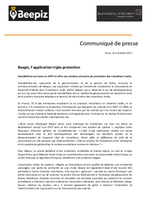 Suivideflotte.net, spécialiste de la géolocalisation et de la gestion de flotte, annonce la commercialisation de Beepiz, une application mobile qui transforme simplement le Smartphone en Dispositif d'Alerte pour Travailleurs Isolés (DATI). Beepiz, qui a nécessité 3 ans de développement, est issu du savoir-faire éprouvé de Suivideflotte.net en matière de géolocalisation et reprend le socle de la solution éponyme adaptée aux besoins de sécurisation des travailleurs isolés.