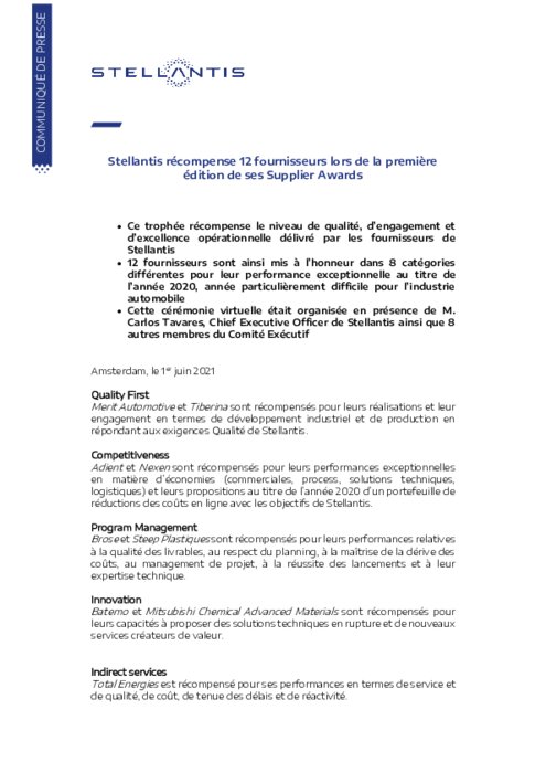 Ce trophée récompense le niveau de qualité, d’engagement et d’excellence opérationnelle délivré par les fournisseurs de Stellantis. 12 fournisseurs sont ainsi mis à l’honneur dans 8 catégories différentes pour leur performance exceptionnelle au titre de l’année 2020, année particulièrement difficile pour l’industrie automobile. Cette cérémonie virtuelle était organisée en présence de M. Carlos Tavares, Chief Executive Officer de Stellantis ainsi que 8 autres membres du Comité Exécutif...