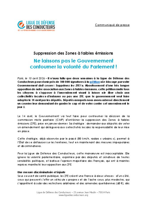 Il n’aura fallu que deux semaines à la Ligue de Défense des Conducteurs pour réunir près de 100 000 signatures à la pétition« Le blocage par votre Gouvernement doit cesser : Supprimez les ZFE ! ». Aboutissement d’une très longue opposition de notre association aux Zones à faibles émissions, cette pétition invite tous les citoyens à s’opposer à l’amendement visant à laisser « le libre choix aux collectivités locales » d’instaurer ou pas une ZFE, que le gouvernement veut faire adopter le 14 avril par les députés. Députés auxquels nous avons adressé directement un courrier leur demandant de garder le cap et de voter contre cet amendement le jour J.