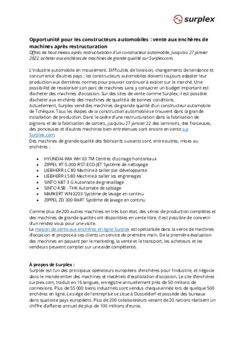 L'industrie automobile en mouvement. Difficultés de livraison, changements de tendance et concurrence d'autres pays ; les constructeurs automobiles doivent toujours adapter leur production aux dernières normes pour pouvoir continuer à exister sur le marché. Une possibilité de revaloriser son parc de machines sans y consacrer un budget important est d’acheter des machines d'occasion. Sur des sites de vente comme Surplex, il est possible d’acheter aux enchères des machines de qualité...