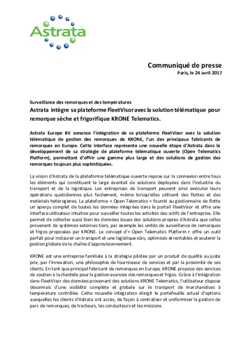 Astrata annonce l'intégration de sa plateforme FleetVisor avec la solution télématique de gestion des remorques de KRONE, l'un des principaux fabricants de remorques en Europe. Cette interface représente une nouvelle étape d'Astrata dans le développement de sa stratégie de plateforme télématique ouverte (Open Telematics Platform), permettant d'offrir une gamme plus large et des solutions de gestion des remorques toujours plus sophistiquées.