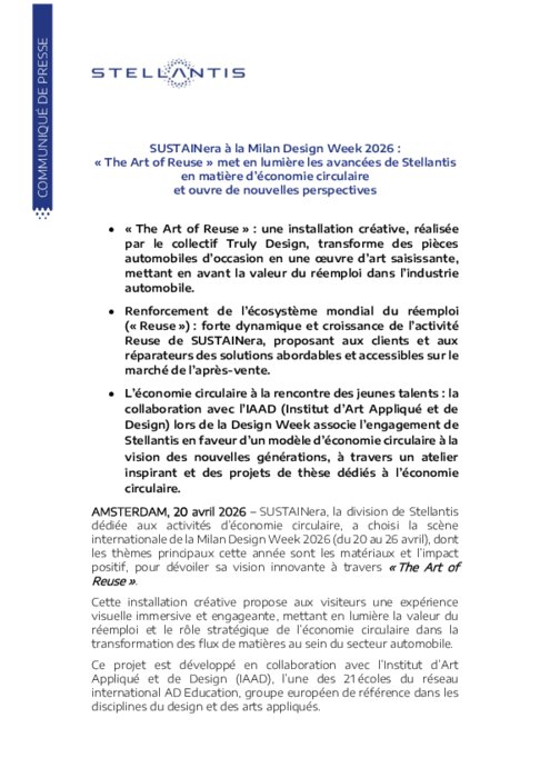 SUSTAINera, la division de Stellantis dédiée aux activités d’économie circulaire, a choisi la scène internationale de la Milan Design Week 2026 (du 20 au 26 avril), dont les thèmes principaux cette année sont les matériaux et l’impact positif, pour dévoiler sa vision innovante à travers « The Art of Reuse ».
